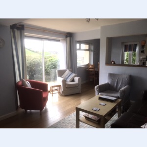 The apartment has a large living room with patio doors overlooking the front garden and surrounding countryside. A fully-equiped open-plan kitchen includes microwave, dining table and breakfast bar.